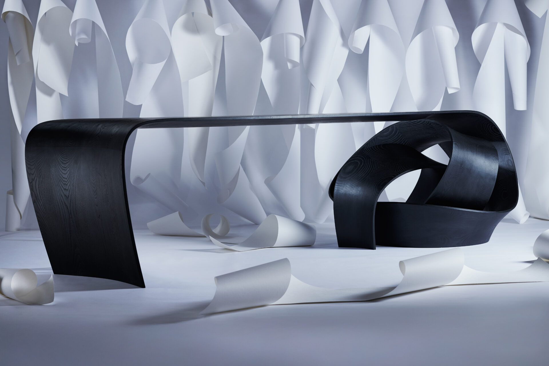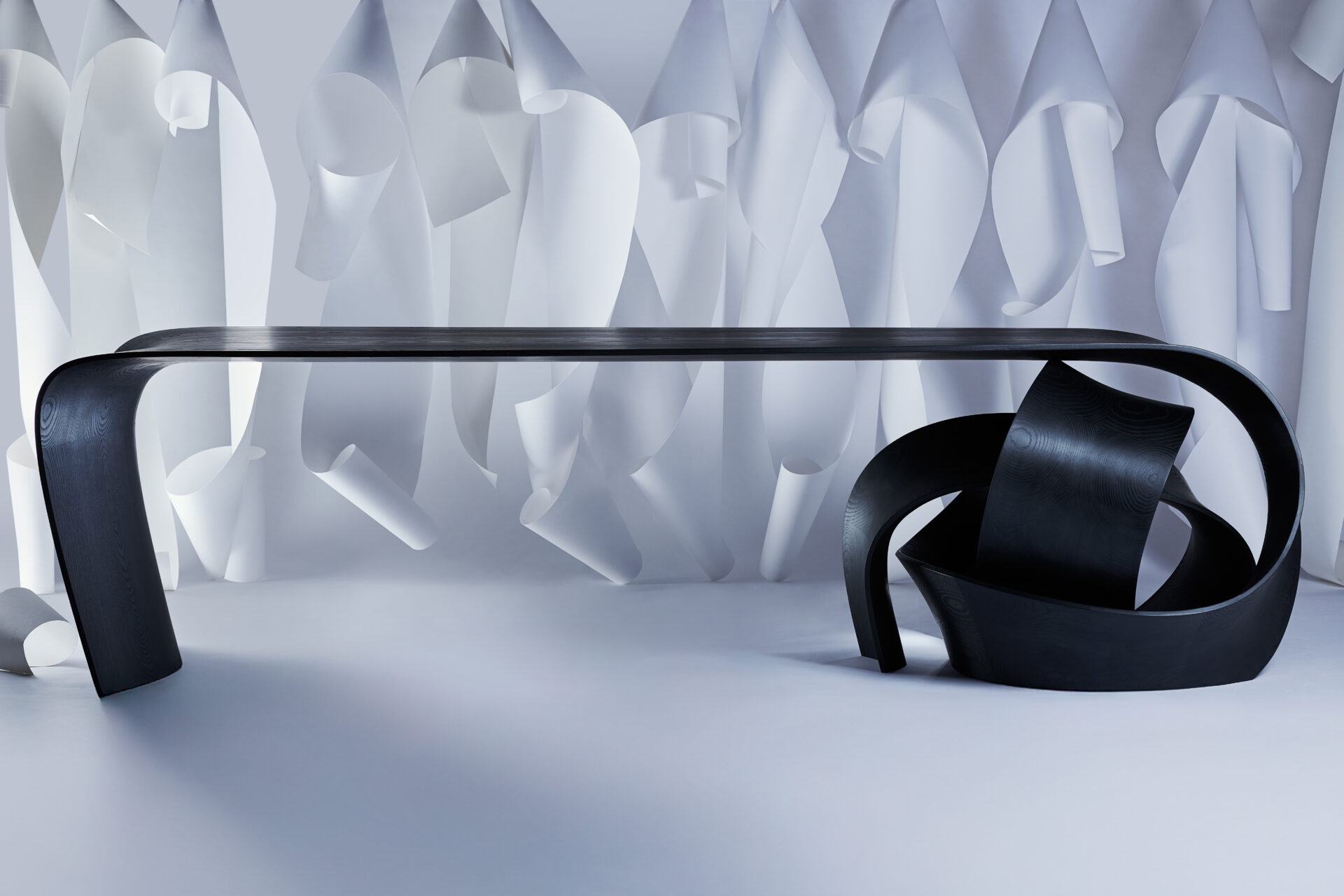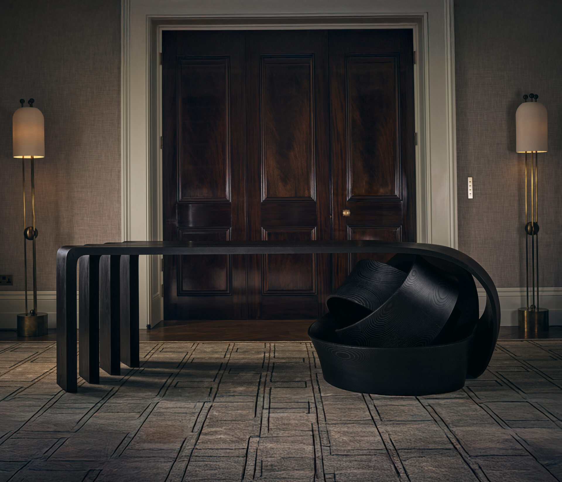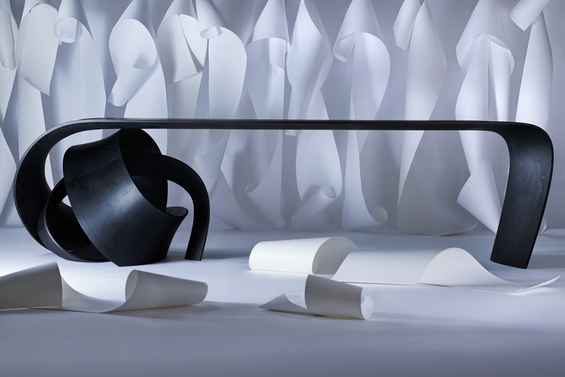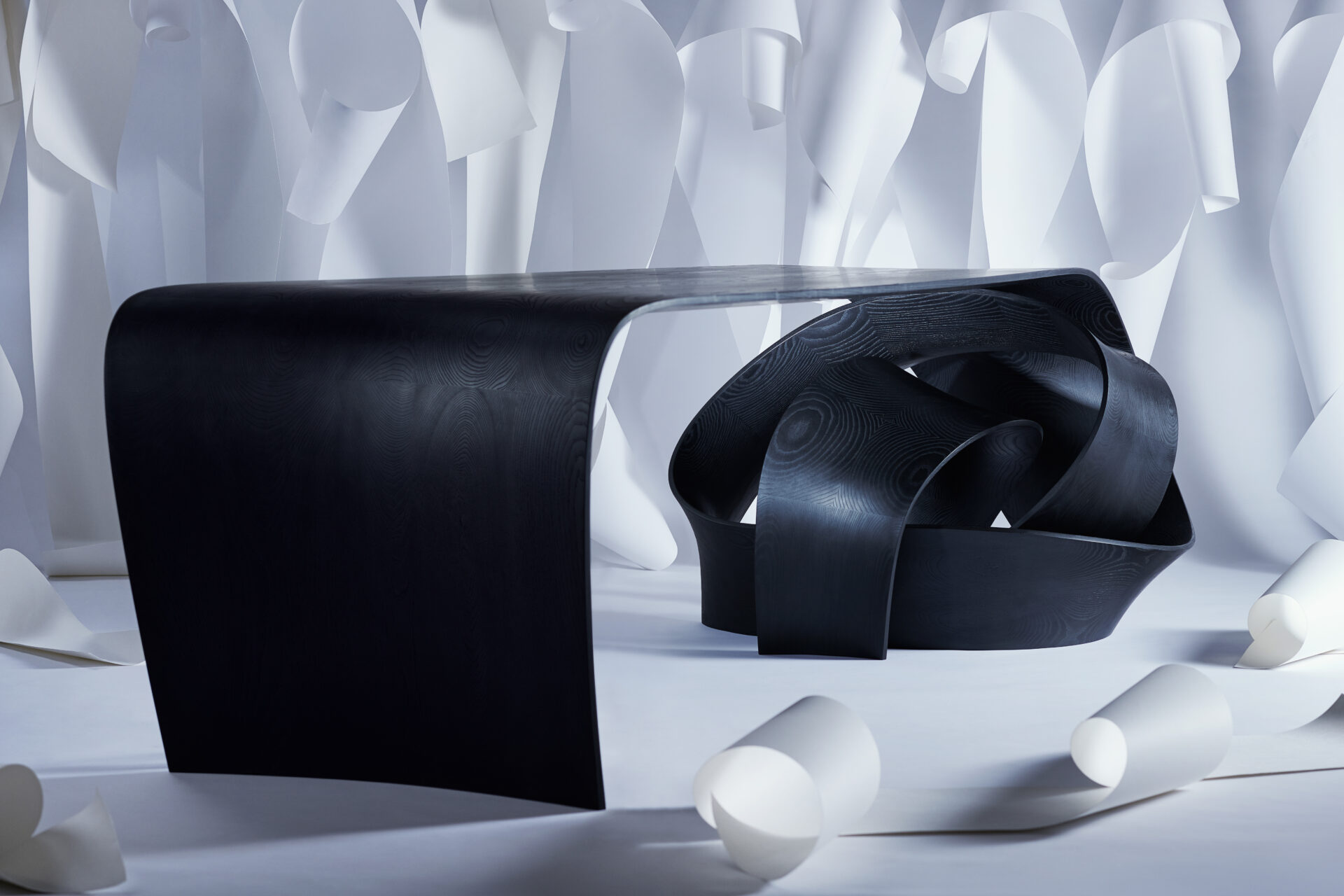 Carved from solid timber and ebonised to a deep, uniform tone, the piece reveals shifting grain patterns that emphasise its movement. Light traces the surface, accentuating each curve as it turns through space. The finish unifies the form, giving coherence to its flowing geometry and quiet sense of momentum.