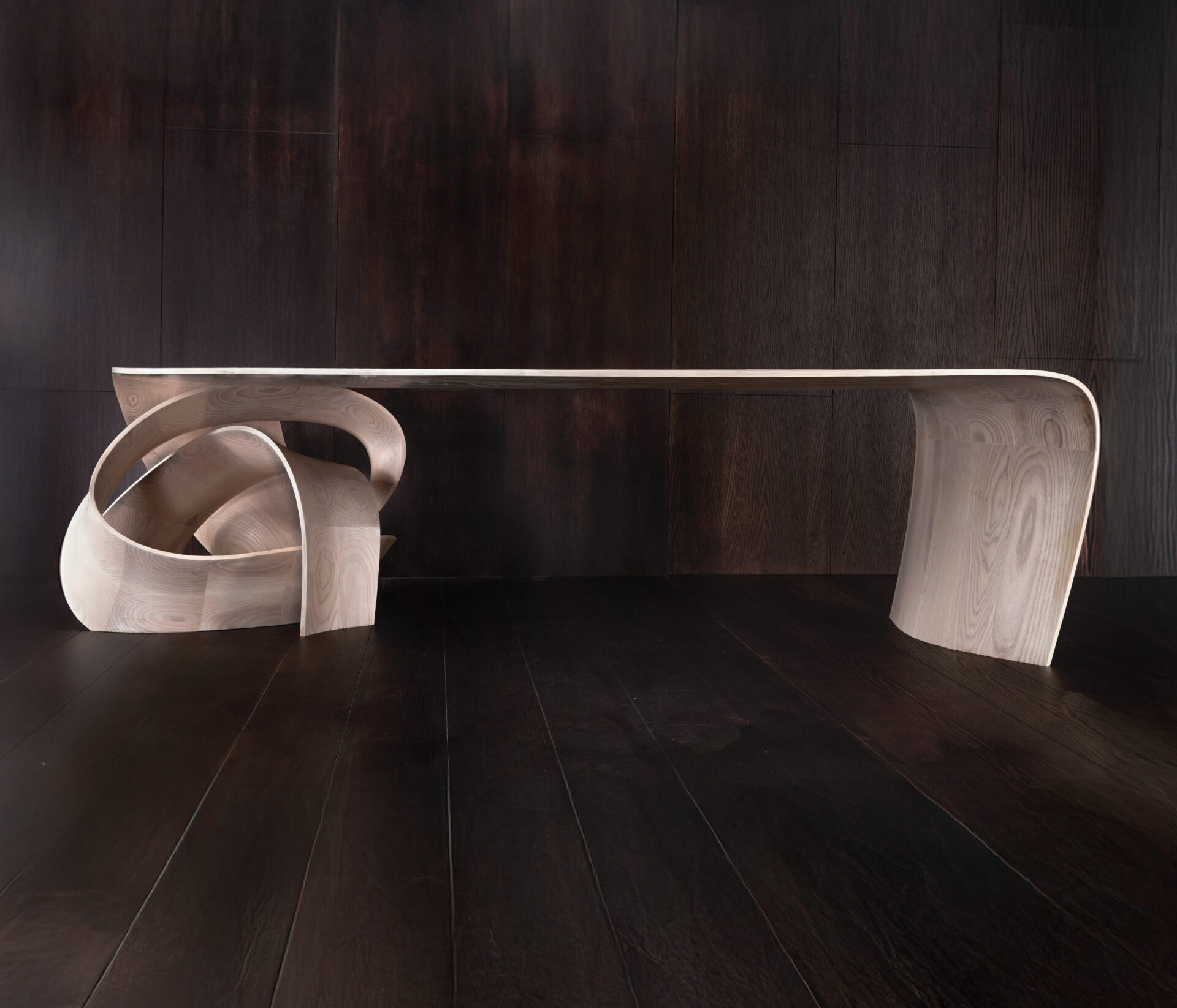 The second desk in the Nodum collection, continuing an exploration into the capture of three-dimensional movement in solid form. Its sweeping compound curves trace paths of flow and momentum, evoking orbital motion frozen in time.