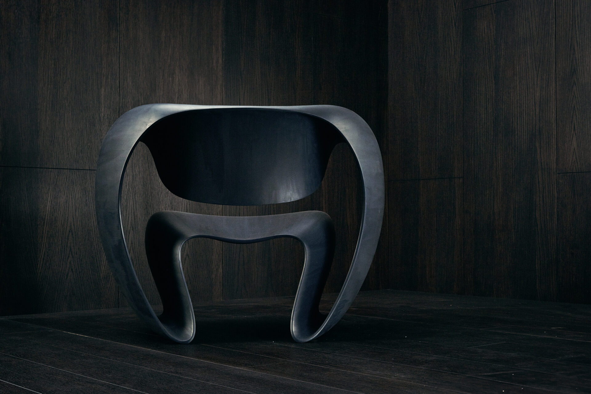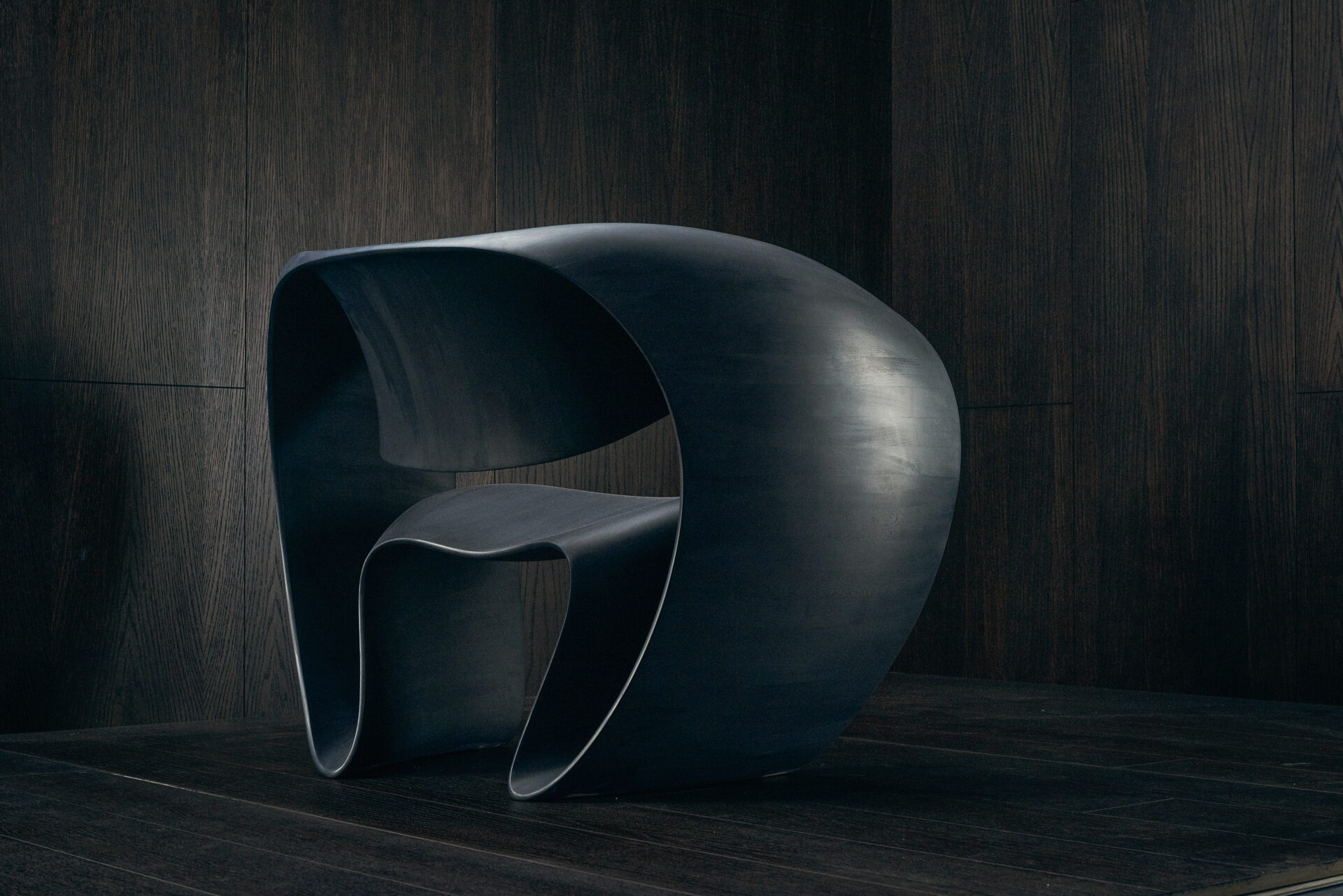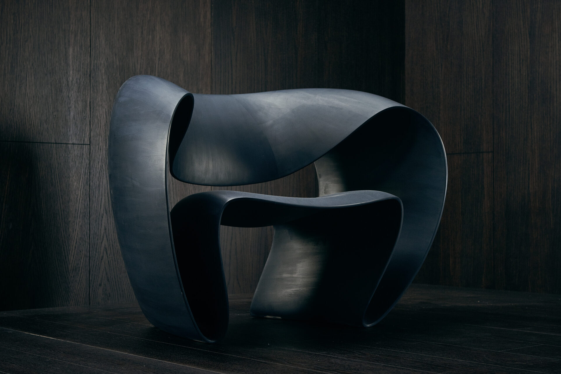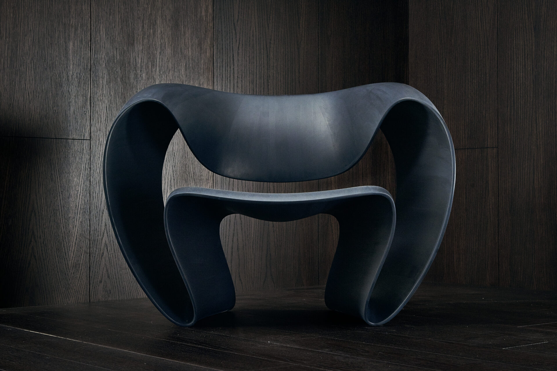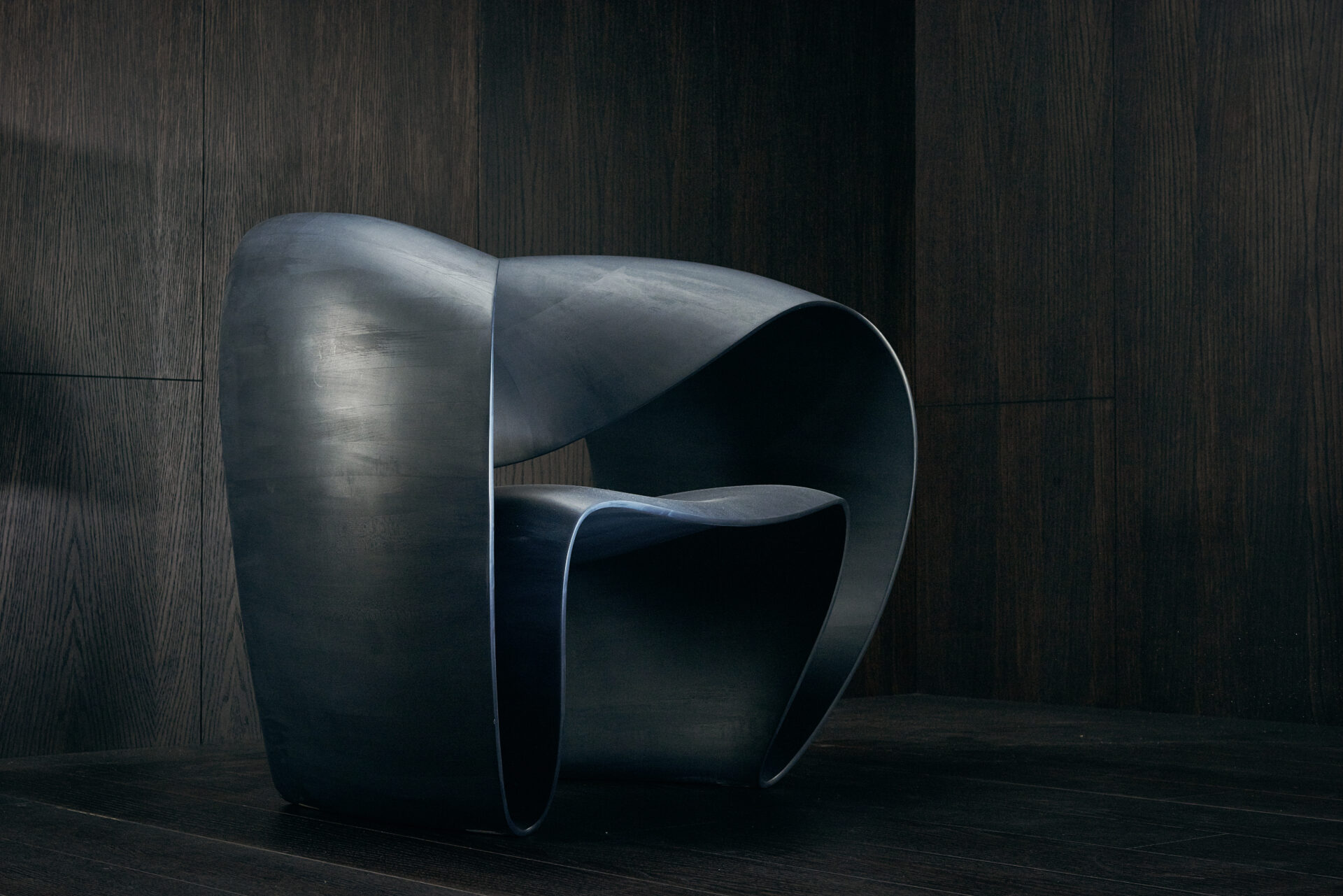 Wood snakes laterally to form a closed loop recliner chair; it is roomy, enveloping.